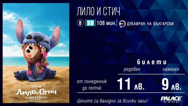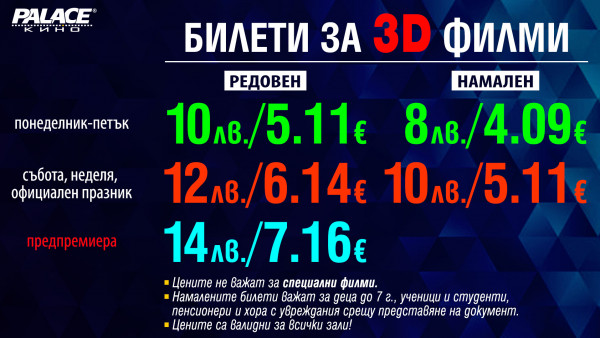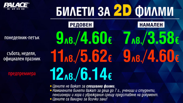 Кино Palace си запазва правото да извършва промени в цените на предлаганите билети, стоки и услуги.